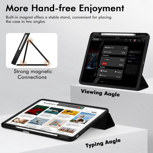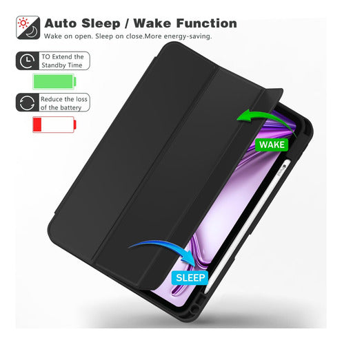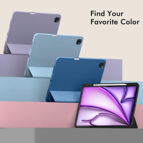 Este estuche está diseñado específicamente para el iPad Air 13 pulgadas M3 2025/M2 2024 (Modelo: A2898/A2899/A2900). No es compatible con otros modelos de iPad. Cuenta con un soporte para el Apple Pencil Pro con una ranura lateral para carga magnética cuando el estuche está puesto. La cubierta frontal tríptica tiene la capacidad de transformar el estuche en un soporte para ver y un soporte para teclado. Soporta la función de Auto Sleep/Wake. Está hecho de PU exterior, forro de microfibra y cubierta trasera de TPU suave, proporcionando protección completa contra golpes, caídas y rasguños. Diseñado con dos posiciones de pie para ajustar el iPad a diferentes ángulos.