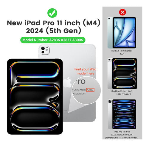 Compatibilidad: diseñado exclusivamente compatible con Apple iPad Pro de 11 pulgadas 2024 (A2836/A2837/A3006), no es compatible con ningún otro dispositivo. Comprueba la parte inferior de tu iPad para encontrar el número de modelo