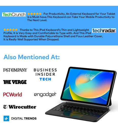 Atraiga la funcionalidad superior y la comodidad inigualable con nuestra funda de teclado premium para iPad de 10.9 pulgadas (10ª y 11ª generación 2022 y 2025 respectivamente). Diseñada para encajar a la perfección con los modelos A2696, A2757, A2777 y el 2025's A16 Chip, esta funda de teclado incorpora un teclado de estilo mágico con un trackpad multitáctil para una navepción rápida y fácil. Transfórmelo en un portátil de alto rendimiento con un solo movimiento suave, gracias al soporte magnético fácil de ajustar y al soporte flotante en voladizo. Perfecto para el uso en viajes, negocios y escuela. Además, cuenta con una fila completa de atajos de iPadOS para ajustar niveles de brillo, volumen o cambiar música con un solo toque. La funda, combinando una base de teclado resistente con una cobertura de cuero sintético vegano, proporciona una protección robusta contra golpes y caídas accidentales. Aparte de su aspecto elegante y su integridad estructural, este estuche de teclado cuenta con una batería de larga duración (750mAh) para una mayor eficiencia, permitiéndote trabajar durante más tiempo con una sola carga. Dimensiones del paquete: 11,73 x 8,39 x 1,02 pulgadas. El producto incluye 1 batería de polímero de litio.