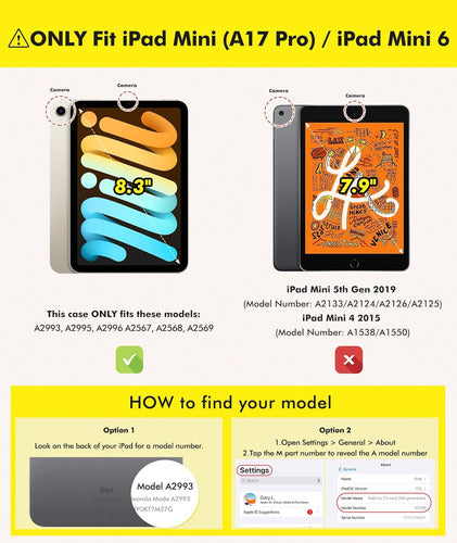 Esta funda INFILAND está diseñada específicamente para iPad Mini 7 (A17 Pro) 2024 y iPad Mini 6 2021 de 8.3 pulgadas. Cuenta con un soporte ajustable en múltiples ángulos para un uso versátil y una cubierta magnética para conveniencia manos libres. Su diseño ultra delgado y ligero la hace fácil de llevar, mientras que su material de alta calidad ofrece excelente protección contra el desgaste diario. No es compatible con otros modelos de iPad.